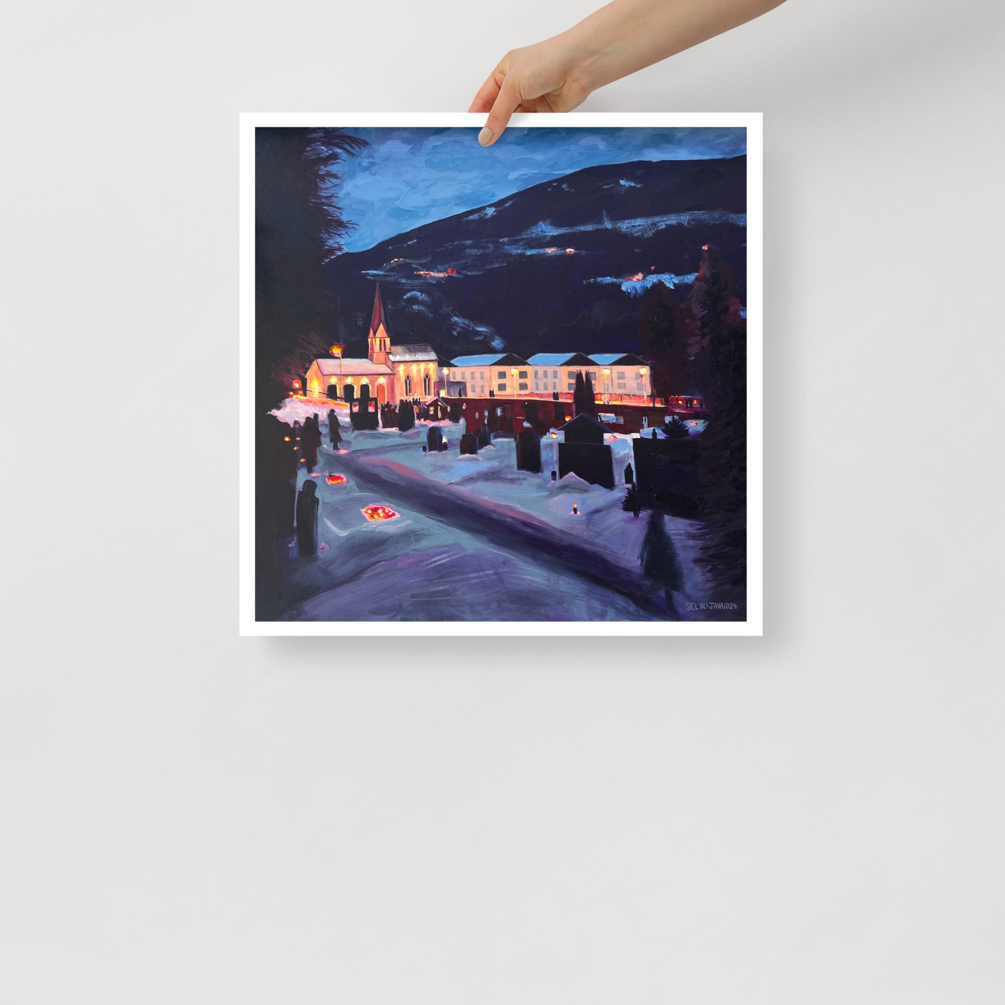 In this painting, Selina records a sense of belonging and place, depicted in a tradition to visit the local village cemetery in Bad Gastein, Austria during Christmas Eve, where the whole village gather to light candles to those who have passed away and listen to the carols singers.