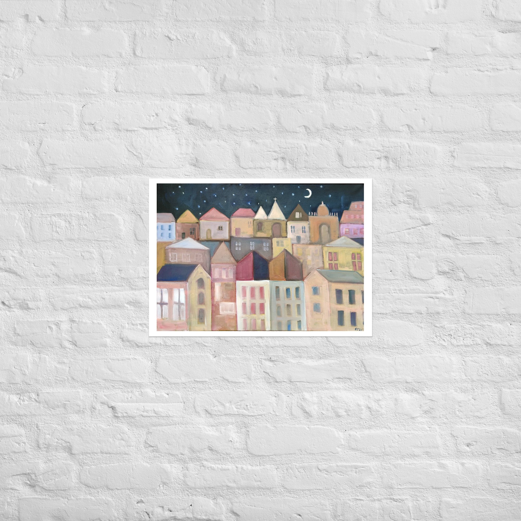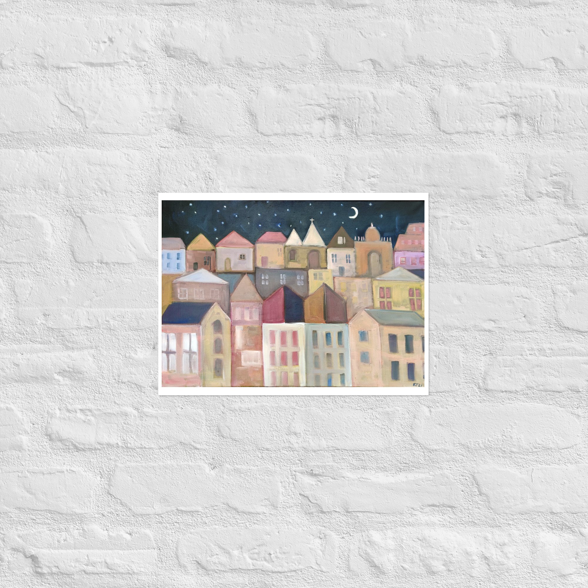 Home is a naive style painting in oil that is reminiscent of the charm of childhood and the cosy feeling of going home.
